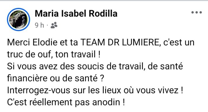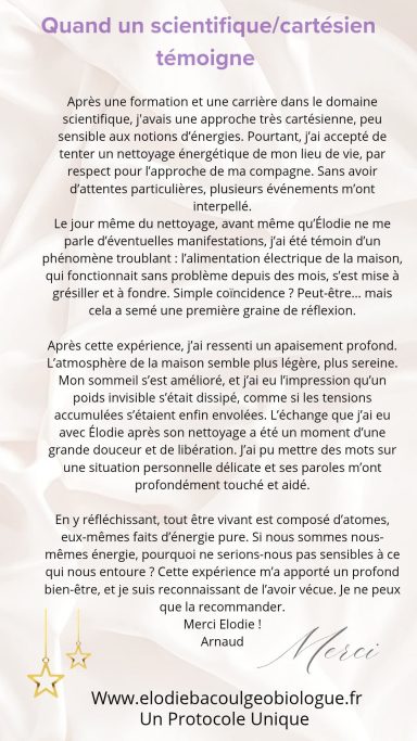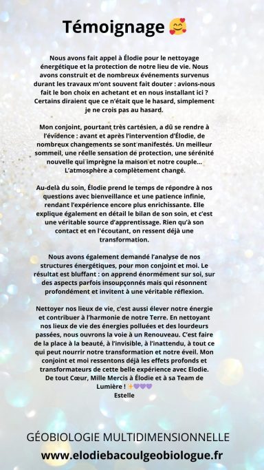 • Reprendre en main les énergies de votre lieu de vie, pour retrouver du calme et l'harmonie chez vous.  J' accompagne aujourd'hui  de nombreux particuliers et professionnels  à travers le monde entier pour nettoyer, purifier, harmoniser et protéger l'intégralité de leur lieu de vie ou de travail.  Mon expertise réside dans ma capacité à analyser,  intervenir et à transformer l'atmosphère, en supprimant les énergies négatives susceptibles d'affecter votre bien-être quotidien en faisant entrer la vibration d'Amour sur le lieu. Mes interventions issues d'un protocole unique, sont réalisées exclusivement à distance. Une méthode unique d'harmonisation et qui n'a pas de limite dans le temps, une fois réalisée.  Cette intervention énergétique  n'est pas un simple nettoyage ou rééquilibrage du lieu , c'est la restructuration vibratoire complète des énergies de votre lieu, qui va aussi oeuvrer dans les profondeurs de votre être et biensûr de tous les occupants  Le lieu devient "un guérisseur énergétique permanent" pour tous les vivants.